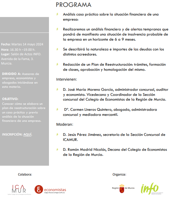 Te invitamos a esta jornada en la que aprenderás a elaborar un Plan de Reestructuración partiendo de un caso práctico, previo análisis financiero de la empresa.