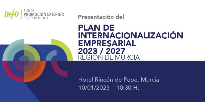 Jornada de presentación del Plan de Internacionalización empresarial de la Región de Murcia para el periodo 2023-2027, que que el Info ejecuta conjuntamente con las Cámaras de Comercio de Murcia, Cartagena y Lorca. Fijará los objetivos y actuaciones para el impulso de las exportaciones regionales, así como las líneas estratégicas de apoyo para reforzar el comercio exterior de la Región de Murcia a través de una amplia gama de servicios y ayudas al conjunto del tejido empresarial.