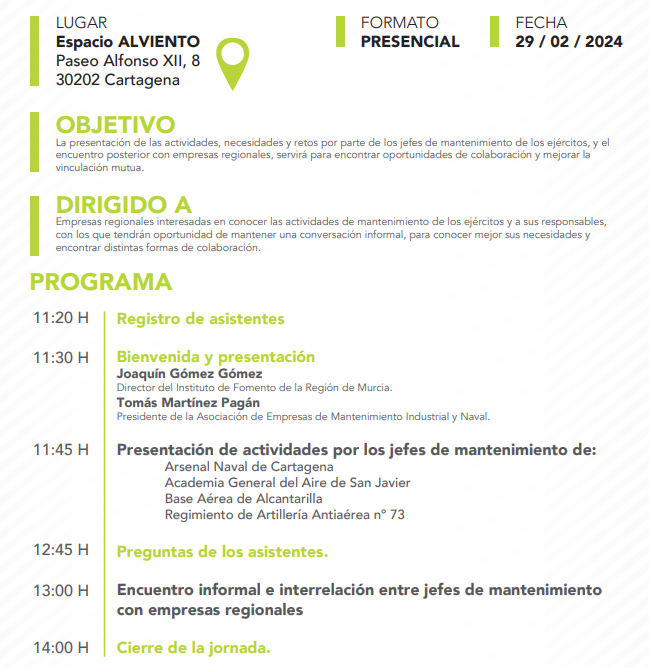 Entérate de las actividades, necesidades y retos por parte de los jefes de mantenimiento de los ejércitos, y el encuentro posterior con empresas regionales en las que encontrar oportunidades de colaboración y mejorar la vinculación mutua. Colaboran AEMIN y Ministerio de Defensa.