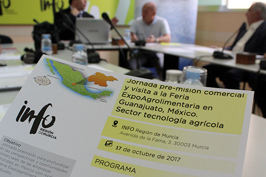 El Instituto de Fomento de la Región de Murcia prepara una misión comercial para apoyar a todas aquellas empresas de este sector que quieran participar en la feria Expo Agroalimentaria de Guanajuato, que se celebra a mediados de noviembre y que está considerada como la más importante de este sector en México y en toda Latinoamérica. Con este objetivo, la agencia de desarrollo regional organizó esta semana un encuentro de trabajo en el que se analizaron las oportunidades de negocio que ofrece el país centroamericano a las empresas de tecnología agrícola.